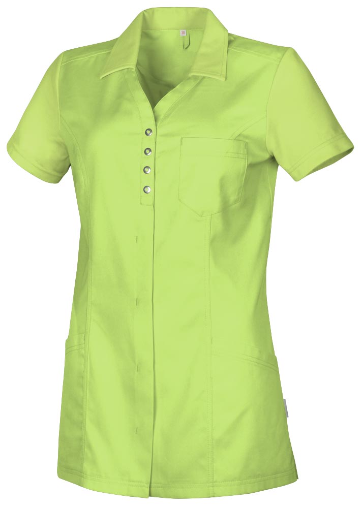 damesjasje ton sur ton, met pique. De kraag, rug en mouwen van stretchstof. V-hals met kraag, half blinde drukknoopsluiting, 1 borstzak, 2 zijzakken met sleutellus, rechts met telefoonzak en zijsplitten.