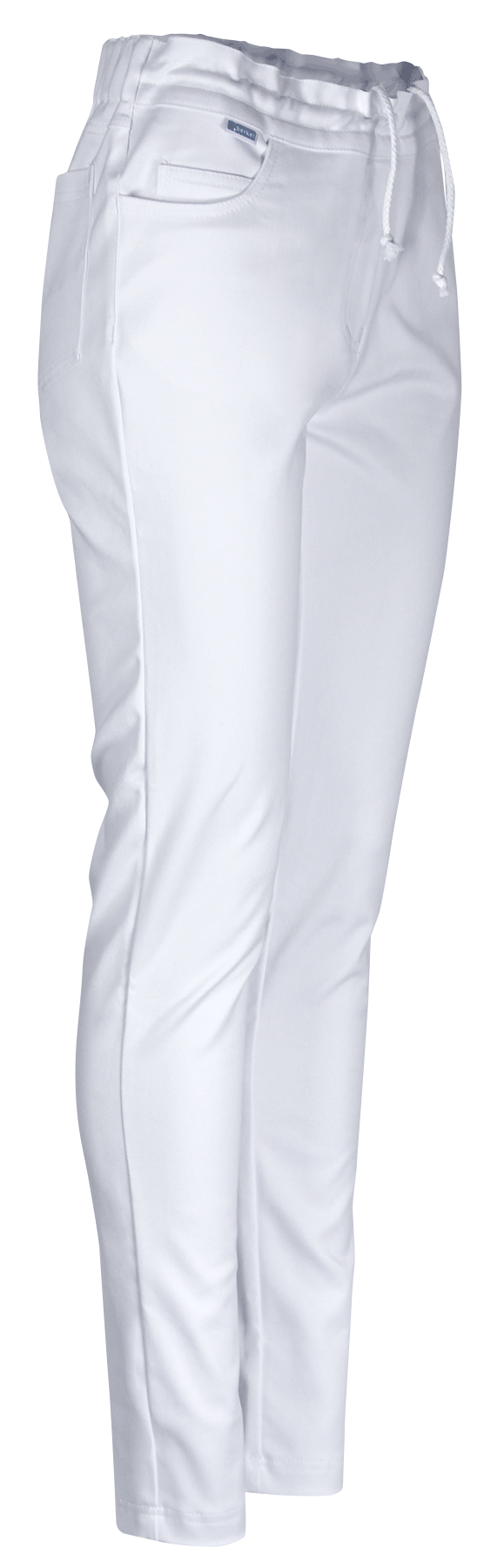 Slimfit casual damespantalon met lage taille, voorzien van decoratieve gulp, 2 zijzakken, 1 geldzak, 2 achterzakken. Tailleband achter voorzien van elastiek en voor met een trekkoord. Uitgevoerd in comfortabele stretch kwaliteit.