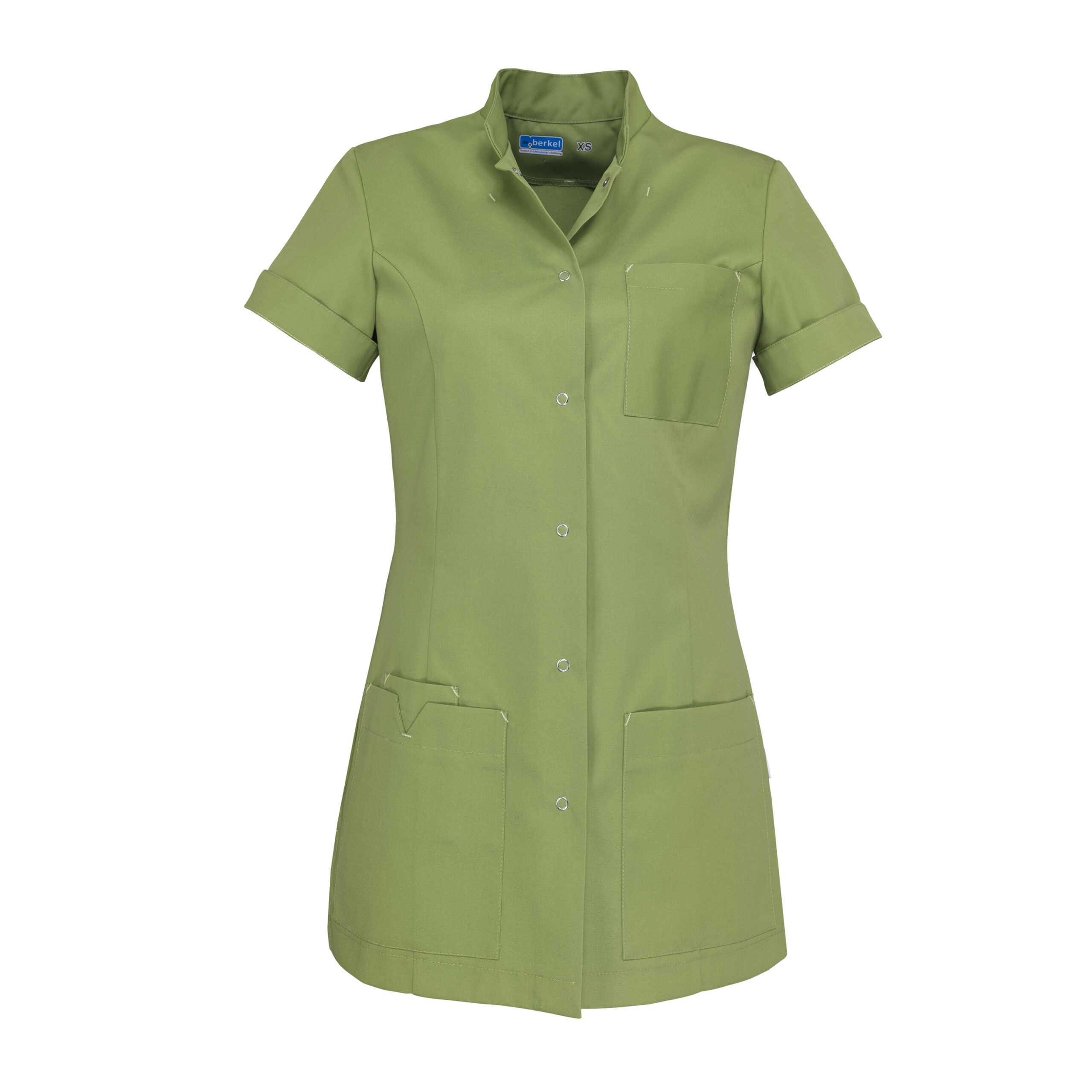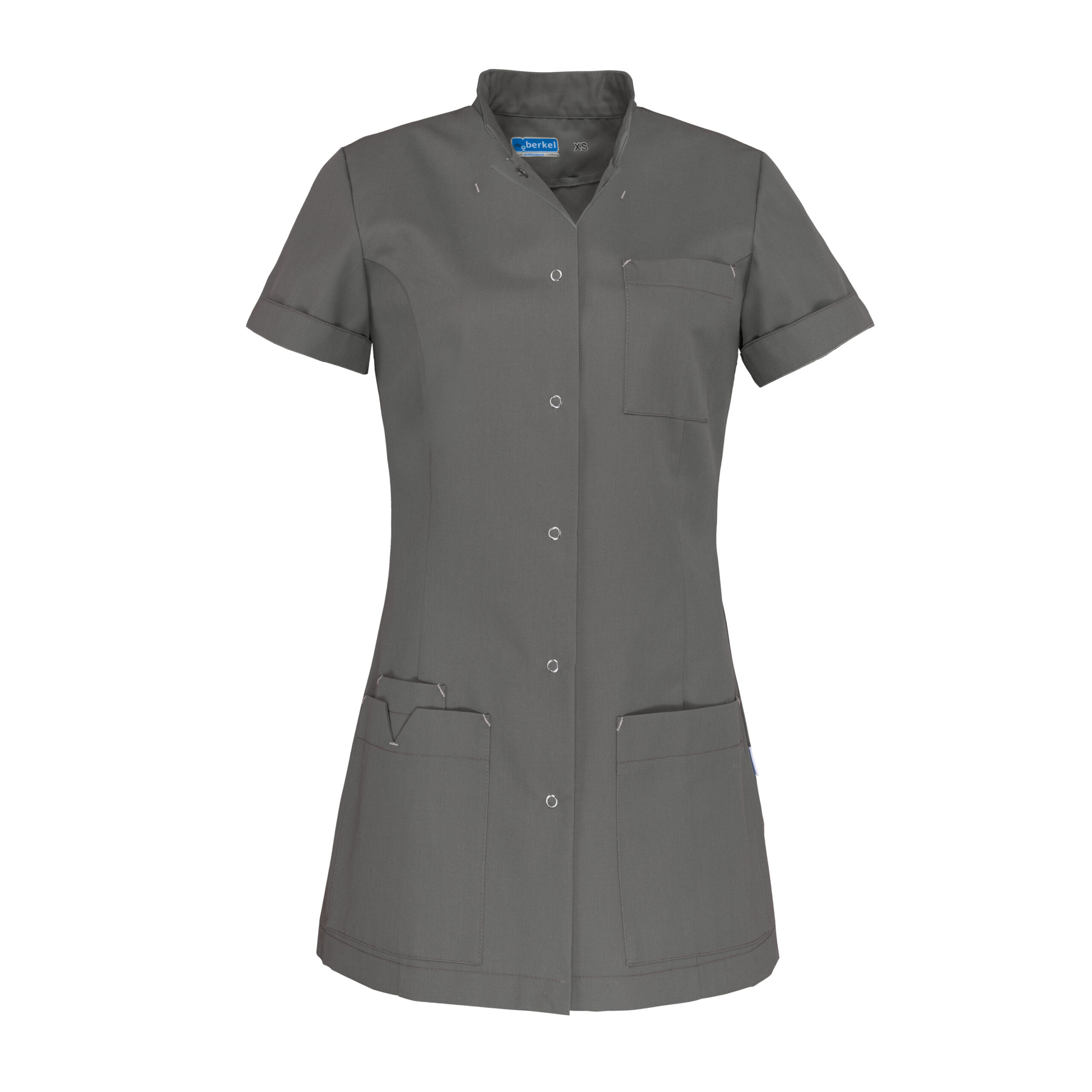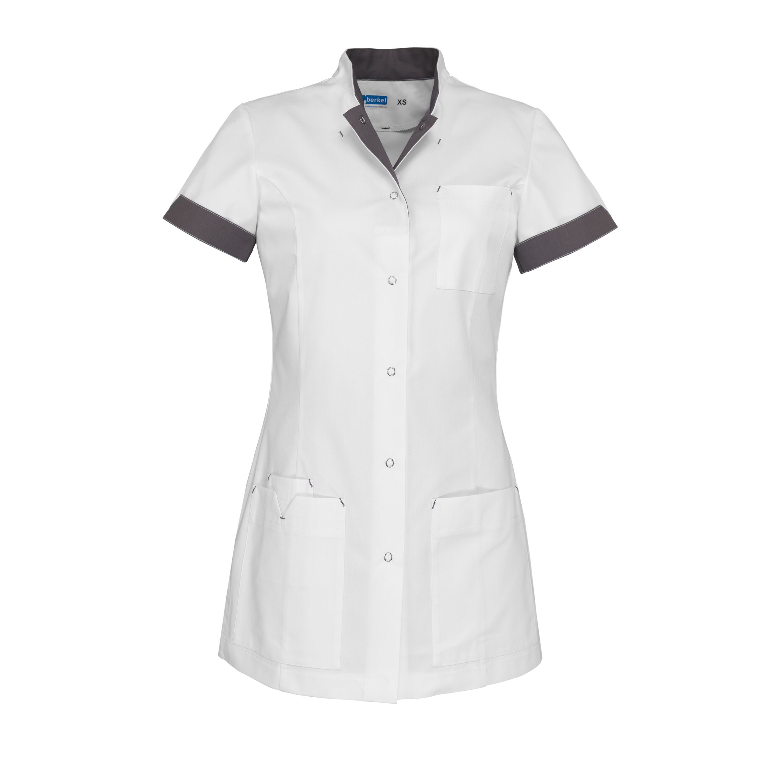 Getailleerd damesjack met opstaande boord, diverse zakken o.a. met telefoonzak, mouwomslag en zijsplitjes. Uitgevoerd in wit met kleurafzettingen aan binnenzijde van boord, mouwen en zijsplitjes