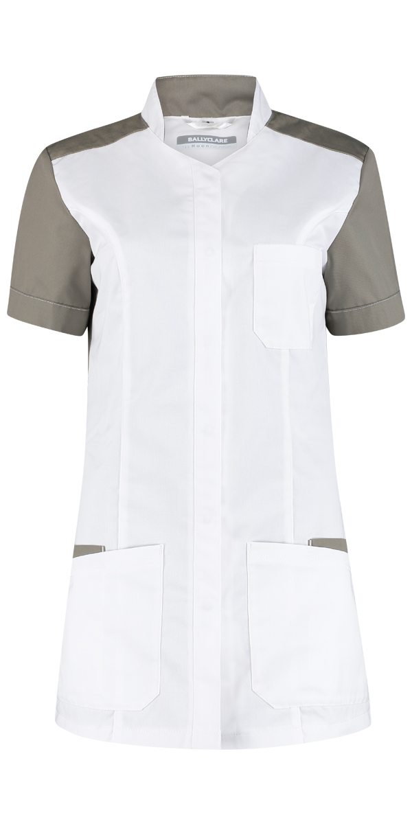 Moderne pasvorm | opstaand boordje | diverse contrastdelen | bedekte drukknoopsluiting | V-halsje | 1 borstzakje | 2 ruime heupzakken met een telefoonzakje in beide heupzakken | 2 splitjes achter | deels Tricot rugpaneel voor extra bewegingsvrijheid | jaslengte ca. 74 cm
